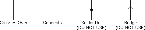 Although some CAD tools permit the use of a "solder dot" to connect wires which would otherwise appear to cross, this is considered poor style since small solder dots are often lost during photocopying while large solder dots obscure the picture. You should not use solder dots in your schematics. Similarly bridges complicate a schematic unnecessarily and should not be used.