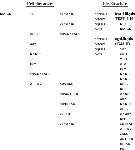 All Gate Array designs use reference libraries. The design file itself will contain a minimum number of cells (typically one), most cells are contained in the reference library. Appendix II shows the cell hierarchy of the sample design together with the file structure in which the design is stored.