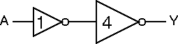 The circuit is simply a pair of inverters with the transistors in the second ratioed such that they have four times the width of those in the first. The nominal drive strength is based on a unit inverter with Wn = 17 lambda and Wp = 34 lambda.