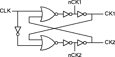 The RS flip-flop consisting of two NOR gates creates the non-overlapping clocks. The two pairs of inverters serve to separate the clock phases further and to generate the inverted clock signals. The resulting waveforms are shown below.
