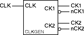 Since each of the inverters generating one of the clock outputs has a nominal drive strength of only 1 the clock signals will need to be further buffered before driving more than a few MSDR circuits.