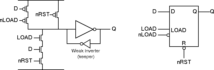As with the edge triggered D-Type, an active low asynchronous reset has been included. For correct operation the two reset signals nRST1 and nRST2 should be connected together (thus master and slave latches are reset simultaneously).