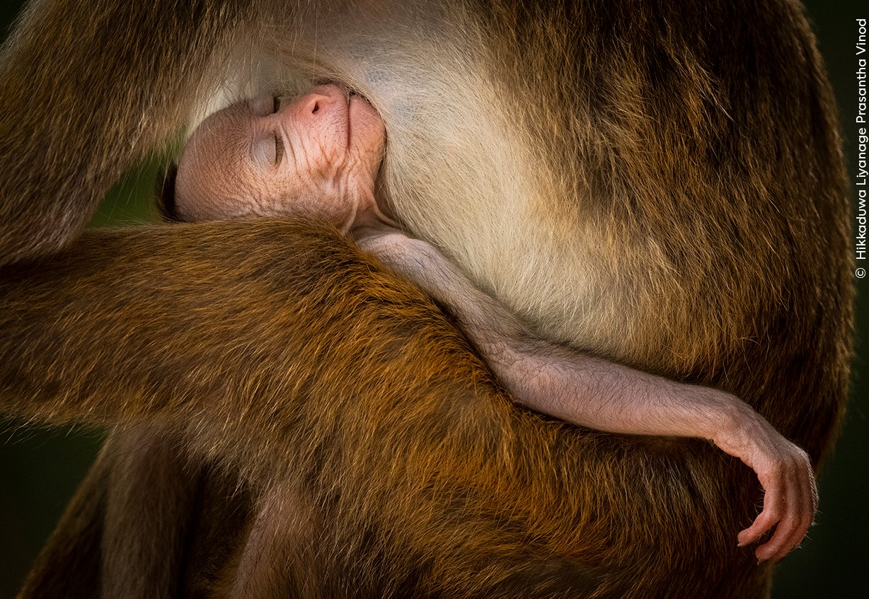 A young toque macaque sleeping in its mother’s arms, in Wilpattu National Park, Sri Lanka.