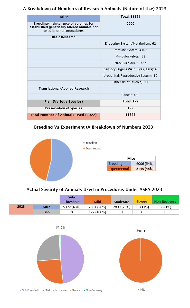 The above data is collected and returned to the Home Office at the end of January each year. The figures for the number of animals used in procedures and severity thresholds for the previous year will be updated on this website as soon as possible, once figures have been sent to the Home Office.