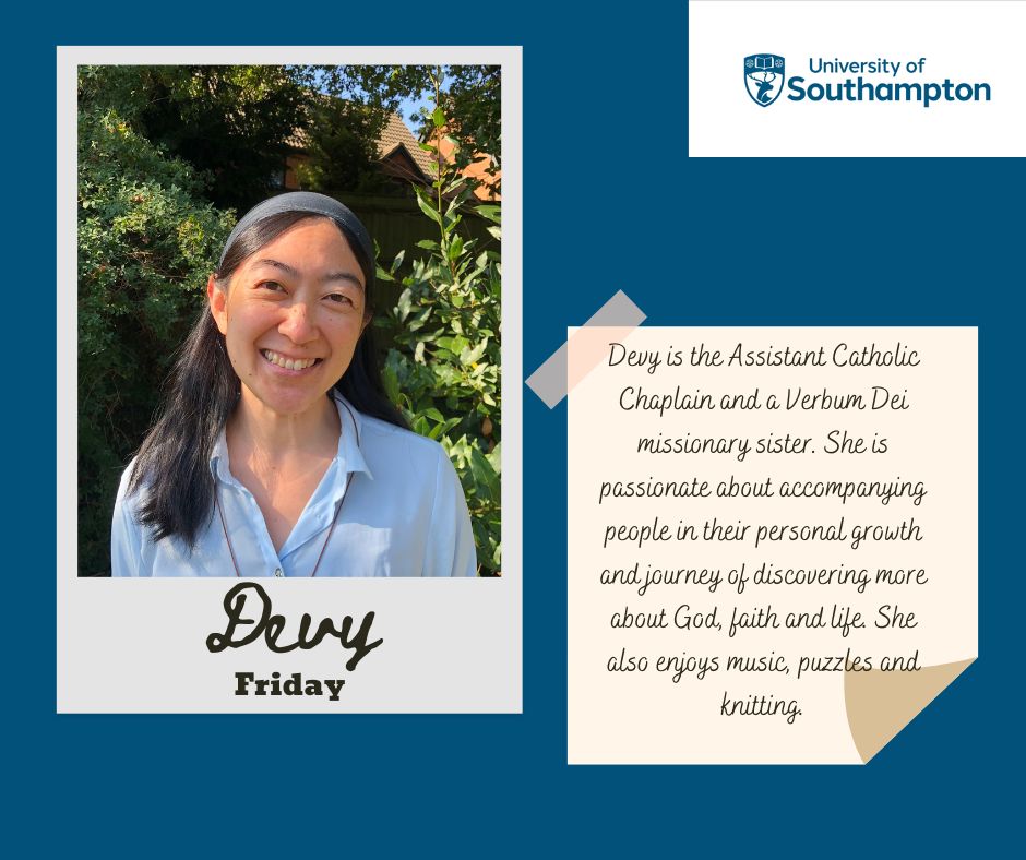 Devy is the Assistant Catholic Chaplain and a Verbum Dei missionary sister. She is passionate about accompanying people in their personal growth and journey of discovering more about God, faith and life. She also enjoys music, puzzles and knitting.