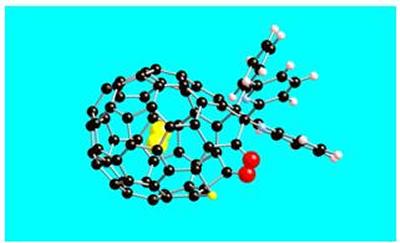 Hydrogen molecule (yellow) trapped inside a fullerene cage (black).