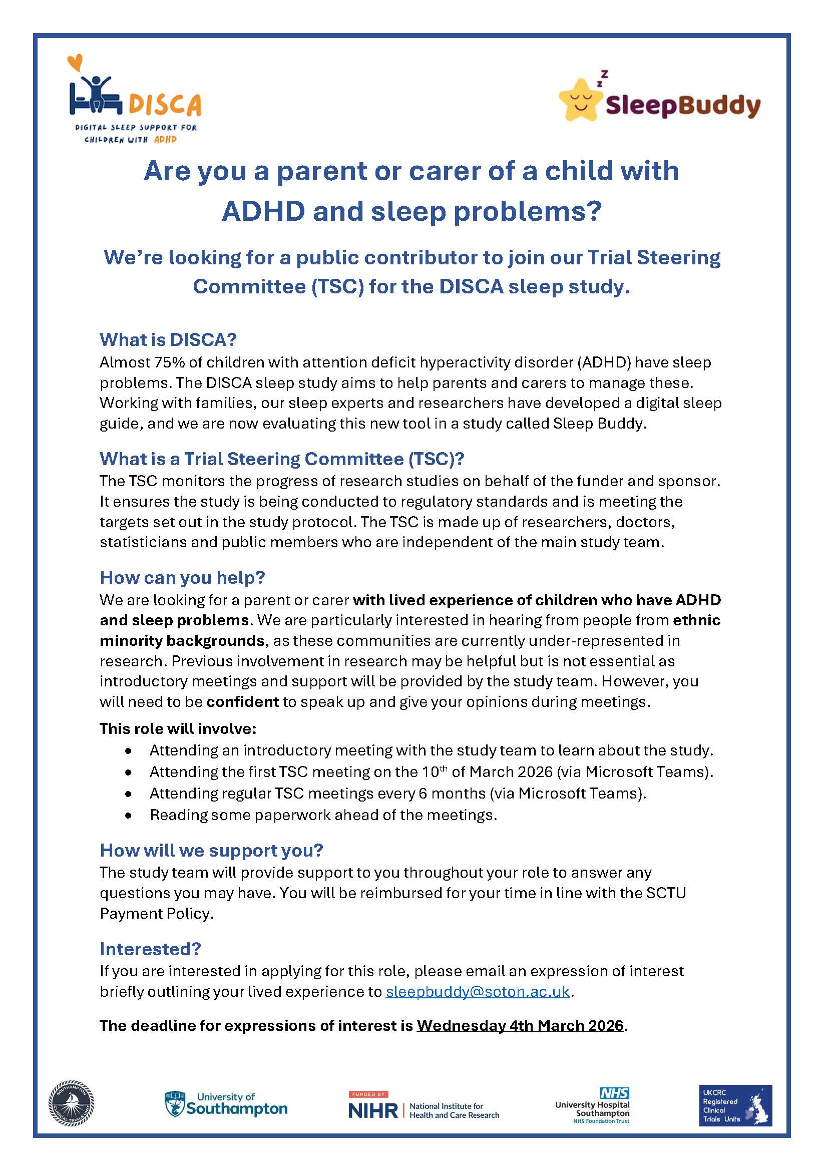We're looking for a public contributor to join the Trial Steering Committee for the DISCA/Sleep Buddy study