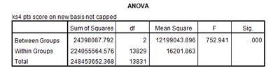 Because an ANOVA test works like a t test, we are again looking for a p-value of less than 0.05 in order to say that there is a statistically significant difference in GCSE scores across the three categories of s1truan . In the table above, we can see that the significance level for this ANOVA is 0.000, well below the 0.05 threshold. This means that there in fact differences in GCSE scores between young people who were persistently truant, those who were occasionally truant, and those who were never truant.