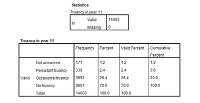 In the Truancy in year 11 table above, we can see that there are a total of 171 cases in which a young person didn’t answer the question about truancy. These unanswered cases are effectively missing data, as we do not know whether or not these 171 people were ever truant. Therefore, we can code these responses as missing.