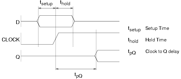 For successful operation, data must be available for at least tsetup before the rising clock edge and at least thold after the rising clock edge.