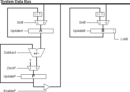 Your controller will generate the UpdateA, UpdateB, UpdateP, Shift, ZeroP, Subtract & EnableP control signals based on the Start input and the LsbB feedback signal.