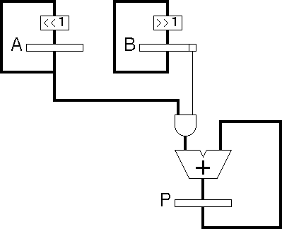 The simplest algorithm for multiplication involves repeated shift and add operations. In the figure below, the register A is initially loaded with the multiplicand and the register B is initially loaded with the multiplier while P which will contain the partial product is initially zero.