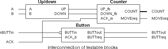 During the testing stage, the separate blocks will be reconnected to give the originally specified functionality. Due to the careful choice of signal names, this split circuit will simulate as if it was reconnected thereby assisting with design verification.