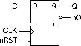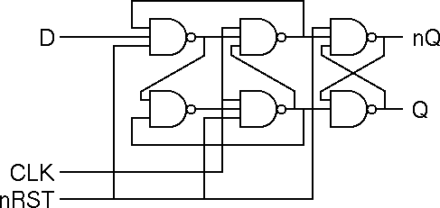The circuit is a standard six NAND gate implementation. Q takes on the value of D on the rising edge of the clock signal, CLK. The active low asynchronous reset signal is named nRST. An inverted output nQ is also supplied.