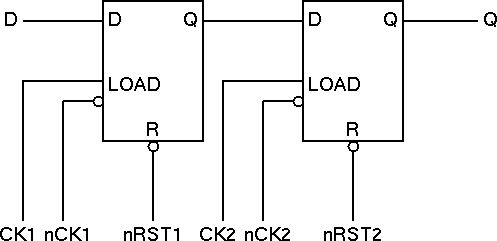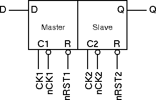 As with the edge triggered D-Type, an active low asynchronous reset has been included. For correct operation the two reset signals nRST1 and nRST2 should be connected together (thus master and slave latches are reset simultaneously).