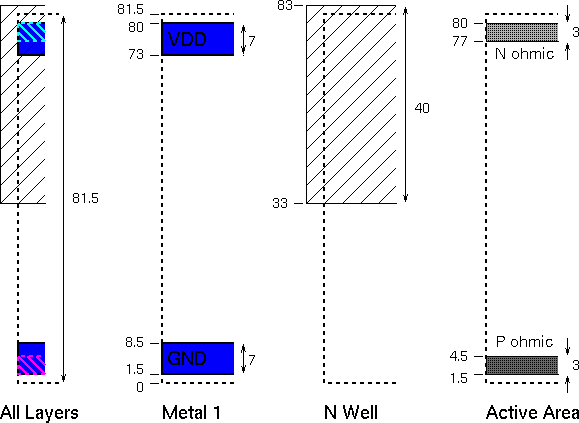 Note This explains why the power and ground rails are 1.5 lambda from the top and bottom of the cell. Some cell libraries will have this spacing set to zero to allow butting of power rails when cells are butted vertically. This is not permitted here since it leads to problems with wide metal (greater than 10 lambda). See rule 7.4 for details.