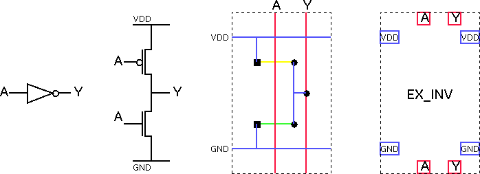 The last of the representations is known as a layout abstract or simply a black box representation. When we draw gate level circuit schematics we use the symbol for the inverter since we are not concerned with the implementation of the inverter only its function. Similarly when we draw a module layout including inverters and other leaf cells, we prefer to use the abstract representation of the inverter since it tells us exactly what we need to know in terms of the location, name and conductor type of each input and output together with an outline which tells us the extent of the cell (without the clutter created by including internal detail).