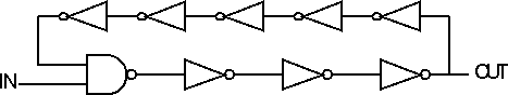 Note that the ring oscillator, typically one with a larger number of inverters (e.g. 19 inverters and no NAND gate) is a common test circuit included on drop-in chips which are found on every wafer in order to monitor process parameters.