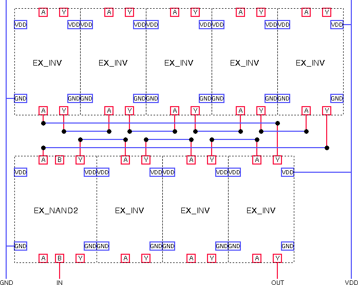 Note that the wiring of VDD and GND is implicit where two leaf cells are butted within a row since the VDD and GND ports of one abstract butt against those of the adjacent abstract. Note also that this module uses a strict two conductor routing strategy with metal 1 horizontally and polysilicon vertically (the exception being the vertical power rails to the left and right which must always be in metal).