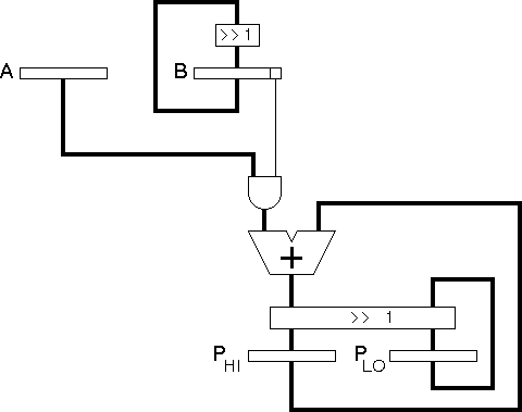 The simplest algorithm for multiplication involves repeated shift and add operations. In the figure below, the register A is initially loaded with the multiplicand and the register B is initially loaded with the multiplier while P which will contain the partial product is initially zero.