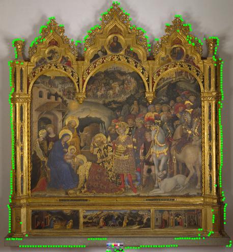 The neural-tester application allows us to view the input alongside the output confidences. So the output, based on the border finder of the above image, gives 77% confidence that it is a triptic painting - which is a fairly high confidence - and with good reason. It's correct!